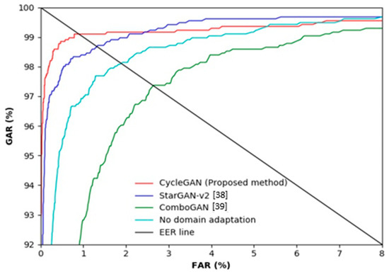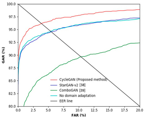 Table 10 and Figure 9 show the accuracy of finger-vein recognition obtained by various domain adaptation methods. The experimental results showed that the accuracy is significantly higher when the proposed CycleGAN-based method is used compared to when a domain adaptation method is not applied or other domain adaptation methods were used. Thus, the feature information that can be obtained from SDUMLA-HMT-DB has been well adapted while partially maintaining the unique shape information of HKPolyU-DB. The results of StarGAN-v2 and ComboGAN are poorer than those of the proposed CycleGAN. Table 7 and Figure 8 present similar results. Fundamentally, a CycleGAN is a network designed for style transfer between two domains, whereas ComboGAN and StarGAN-v2 are designed for multi-domain transfer. Particularly, a StarGAN-v2 can not only simply discriminate between real or fake data using a style code but can also discriminate the type of domain generated. In a multi-domain focused architecture, performance is poorer as the discrepancy between domains is greater. Only a specific region cannot have high activation due to the trait of finger-vein data, and the heterogeneity in the shape information is noticeably significant even if the databases appear similar. Furthermore, ComboGAN not only mitigates the number of generators which increases with multi-domain transfer cases but also attempts to solve the problem of deteriorating performance caused by a greater difference in the domains of the existing StarGAN. However, the encoder and decoder separated by the number of domains recognize a specific database as one style as proposed by the ComboGAN, i.e., it failed to completely learn the domain distribution.
