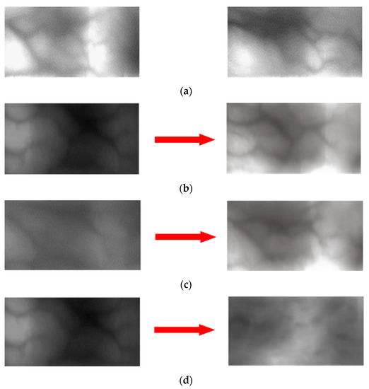 Unlike Figure 12, Figure 13 summarizes the error cases generated in the no adaptation method where HKPolyU-DB was used as the training set, and in the proposed method where HKPolyU-DB was domain adapted to SDUMLA-HMT-DB. The information was mostly not contained in the images properly for the data of SDUMLA-HMT-DB, which is similar to the data of HKPolyU-DB. In particular, the cases in Figure 13a,b only contained a small amount of finger-vein patterns, and the recognition was performed using the background information during testing. This problem cannot be easily solved by domain adaptation, and therefore, it was not successfully recognized in the case where the proposed method was used. Even though the case in Figure 13c is an authentic matching case, the pixel translation between the enrolled image and the matched image was significantly large, while the forms of the shades slightly varied. However, for the data generated using the proposed method, the finger-vein pattern of each domain was effectively transferred, thus producing robust performance for the finger-vein pattern of SDUMLA-HMT-DB along with the focused form of the finger-vein pattern. This shows that the network was optimized to generate variations in the vein pattern information by focusing on the vein pattern when training the CycleGAN. Figure 13d also shows that it is difficult to identify the overall finger-vein pattern because the finger-vein information is acquired from a limited region; however, a good recognition performance was still observed when the proposed method was used appropriately using the scarcely available finger-vein pattern.