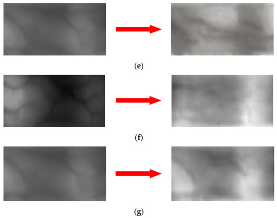 Figure 10 and Figure 11 show examples of the image domains adapted using various methods. Figure 10a and Figure 11a show the examples of the original image; the images on the left in (b)–(g) are the source images and those on the right are images generated through domain adaptation using the source images. That is, the left and right images of Figure 10b–g, respectively, show original images and domain adapted images from SDUMLA-HMT-DB and HKPolyU-DB using various methods ((b), (c) our method, (d), (e) ComboGAN, (f), (g) StarGAN-v2). By comparing the right images of (b) and (c) with those of (d)–(g), the right images of (b) and (c) by our method have more similar image characteristics (including the distinctiveness of vein patterns) to the original images of HKPolyU-DB (Figure 10a) compared to the right images of (d)–(g). In addition, as shown in Figure 11, by comparing the right images of (b) and (c) by our method with those of (d)–(g) by other methods, the right images of (b) and (c) have more similar image characteristics (including to the distinctiveness of vein patterns) to the original images of SDUMLA-HMT-DB (Figure 11a) compared to the right images of (d)–(g).