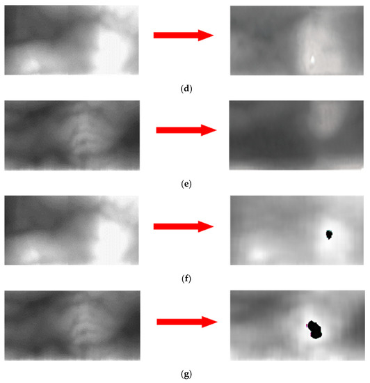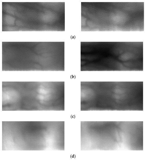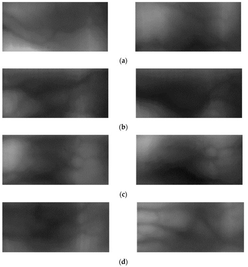 Figure 12c,d are the results of correct recognition when the proposed method was used in which 12c shows the falsely rejected case and 12d shows the falsely accepted case in a scheme where the domain adaptation method was not applied. Figure 12c is an authentic matching case; however, a problem was observed when the intensity of lighting varied during the image capturing trial. However, the data for which domain adaptation was performed are effective against the variance in lighting intensity as such information of the source domain, SDUMLA-HMT-DB, was also transferred. Figure 12d also shows that it is difficult to identify the overall finger-vein pattern because finger-vein information is acquired from a limited region; however, a good recognition performance was still observed when the proposed method was used appropriately using the scarcely available finger-vein pattern. Therefore, a robust performance was achieved for extracting the finger-vein valley through domain adaptation.