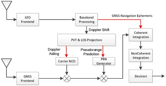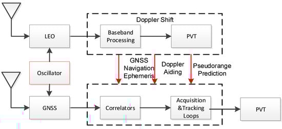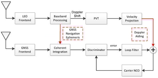 Low Earth Orbit (LEO) satellite systems, most of which are designed for communicating, have higher received power and faster-moving velocity than GNSS, for they are running at the lower orbit. Due to these characteristics, LEO has been recently used for positioning or augmenting the GNSS system [,]. However, these augmentations are still on the system or observable level, which could not improve the GNSS signal received ability, especially under harsh conditions. As for a standalone positioning system, the LEO signal could be used to realize positioning by its Doppler frequency as a Signal of Opportunity (SoOP) [,]. Moreover, LEO satellites have the potential to transmit navigation signals []. Nowadays, it is also considered to transmit the Pseudorandom Noise (PRN) signal as GNSS system to get a more precise position []. Given these functions, the GNSS receiver can use the position information from LEO positioning to estimate the Doppler of the GNSS signal. Moreover, by the navigation signals transmitted by the LEO satellite, the receiver can extend the coherent integration time and further compress the loop bandwidth.
