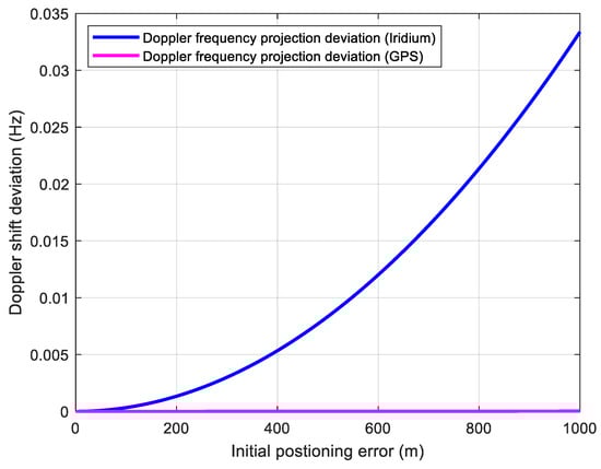 where v and represent the orbital speed and altitude of the satellite respectively. indicates the position error of the receiver. is the speed of light. For LEO-assisted GNSS receivers, the estimated Doppler deviation of LEO signal after projection will be absorbed into the receiver clock frequency deviation. However, the Doppler frequency shift of the GNSS signal will be affected by the position error after LOS projection. Figure 5 shows the effect of receiver position error on Doppler shift estimation. It can be seen from Figure 5 that the Doppler estimation errors caused by the position error on Iridium and GPS dynamics are both small enough to be ignored.