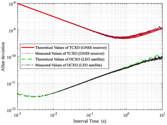 where is the time interval, and is an identity matrix. Figure 6 is the Allan deviation of the simulated clock noise sequences of OCXO and TCXO. It can be seen from the figure that the performance of the clock generated by this clock model is consistent with the theoretical analysis. The Allan deviation of OCXO caused by the oscillator noise is not higher than within 10 s. The stability of TCXO reaches its lowest value around 500 ms. As the time interval is further lengthened, the frequency deviation caused by noise begins to increase gradually.