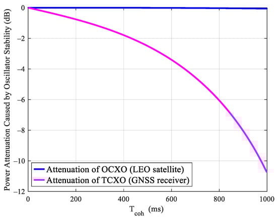 where is the frequency deviation, and represents the coherent integration time. The frequency attenuation of different crystal oscillator types under different coherent integration times can be obtained in combination with Figure 6, which is shown in Figure 7. It can be seen from this figure that as the LEO satellite uses OCXO, the impact of clock noise can be negligible under the coherent integration time within 1 s. Since the GNSS receiver adopts the TCXO oscillator, the signal power attenuation increases along with the coherent integration time. That is the reason why the integration time cannot be compressed indefinitely. It can be seen from the figure that to make sure the gain attenuation is no more than 2 dB, the maximum coherent integration should not exceed 400 ms. Furthermore, it is obvious that a receiver using OCXO can use a longer coherent integration, which could achieve several seconds when an ultra-stable clock is used [,]. However, the motion and non-linearity of the receiver should be considered carefully for such a long coherent integration. Thus, we just take the most common TCXO as the clock of the receiver in this work.
