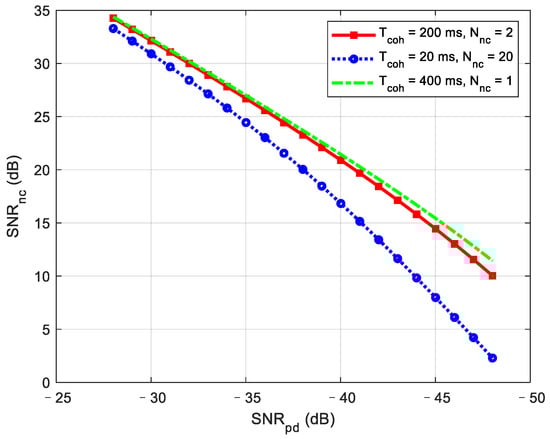 where and indicate the signal pre-detection bandwidth and coherent integration time, respectively. As the coherent integration time increases, the oscillator noise of the receiver accumulates to produce a frequency deviation, which causes the attenuation of the coherent integral gain. To avoid attention, non-coherent accumulation is adopted following coherent integration. The gain of non-coherent accumulation is as follows: