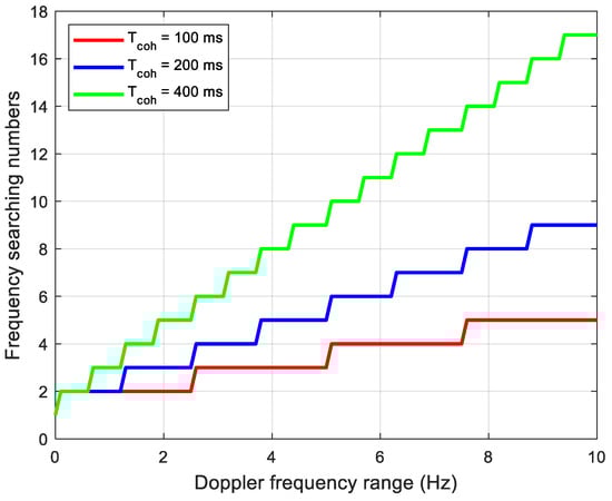 Concerning frequency searching, a different coherent integration time corresponds to different frequency steps. According to the analysis of Section 3, in the LEO positioning-assisted GNSS receiver structure, the frequency error mainly comes from the accuracy of the receiver clock. For commonly used TCXO, the frequency error range is (−10 Hz, 10 Hz). In addition, the stability of the clock limits the coherent integration time to 400 ms. The frequency search step is 2.5 Hz corresponding to a coherent integration time of 200 ms. Figure 10 shows the relationship between Doppler shift deviation and frequency search times under different coherent integration times. It can be seen that a longer integration time leads to larger numbers of frequency searching. Therefore, it is necessary to consider the balance between the SNR gain and the time required to search the entire range of frequency uncertainty. Compared with 200 ms coherent integration, the frequency search step is halved in 400 ms coherent integration, resulting in quadrupled search time. On the other hand, the frequency error caused by the instability of the receiver and the satellite clock increases as the coherent integration time increases. The coherent integration attenuation increases accordingly. Therefore, as a result of compromise, the coherent integration time is set to 200 ms in the implementation.