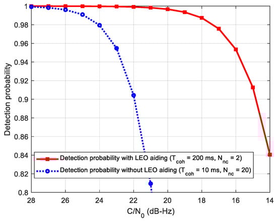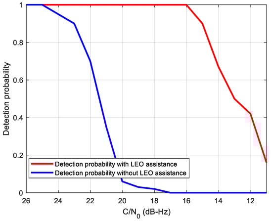 where Γ(·) is the Gamma function, and k represents the degrees of freedom. Here, k is twice the non-coherent number. Assuming that the false alarm probability is 0.5%, the threshold and detection probability can be calculated. Figure 11 gives the comparison of the signal detection probability of the two methods, where the coherent integration time is set to 200 ms with two non-coherent integrations according to the analysis above. It can be seen from this figure that the detection probability can reach 91% at C/N0 = 15 dB-Hz using the proposed method, which combines 200 ms coherent integration and two non-coherent integrations. However, the detection probability with 91% of the standalone receiver is at 22 dB-Hz. That means that the LEO-assisted acquisition has about 7 dB gain with regard to the detection probability.