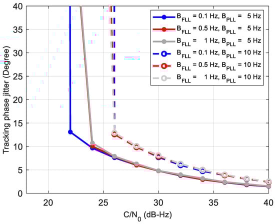 For comparison, the performance of the third-order PLL filter with second-order FLL assist [] in a standalone receiver is analyzed by simulation firstly. The coherent integration time is set to be 20 ms due to the navigation bit reversal. The discriminator of the PLL is atan (QP/IP), and that of the FLL is . Figure 12 shows the phase jitters of the tracking loop under different coefficients. From the figure, we can see that the phase jitter and tracking sensitivity are basically dependent on the bandwidth of the PLL. When the PLL bandwidth is 10 Hz, it loses lock at 26 dB-Hz, regardless of the FLL bandwidth. In contrast, the PLL loop with 5 Hz has a smaller phase jitter and can track the 22–24 dB-Hz signal, which is almost consistent with the results of the classical reference []. Thus, in the 2nd order FLL-assisted 3rd-order PLL structure, the FLL can reduce the impact of the dynamic. However, when the dynamic is eliminated, the bandwidth of the PLL decides the tracking sensitivity. Moreover, a narrower PLL bandwidth induces a smaller phase jitter and a better tracking sensitivity.