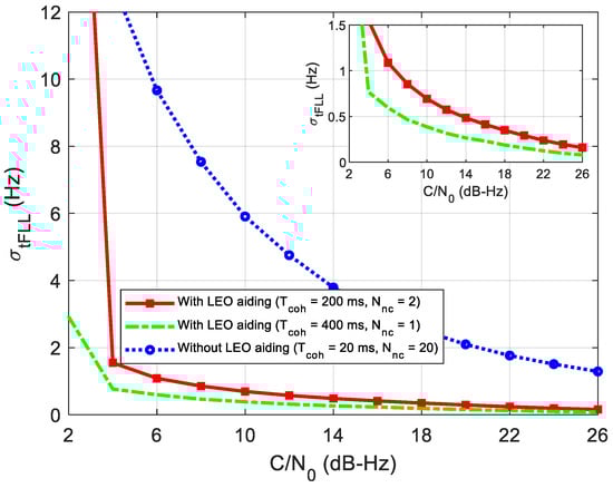 To solve the problem of the loss of lock under an ultra-low SNR condition, such as wideband jamming and signal blocked navigation, we propose the LEO-assisted GNSS tracking method in Figure 3. Since the dynamic is eliminated in the new method and the GNSS ephemeris can be received from the LEO, the receiver can extend the coherent integration time and reduce the loop bandwidth to track the ultra-weak signal. With the known ephemeris, a frequency-locked loop can be used instead of the PLL to improve the tracking sensitivity furtherly. In FLL tracking, the frequency jitter caused by mechanical vibration and Allan variance can be ignored []. The frequency jitter mainly comes from thermal noise.