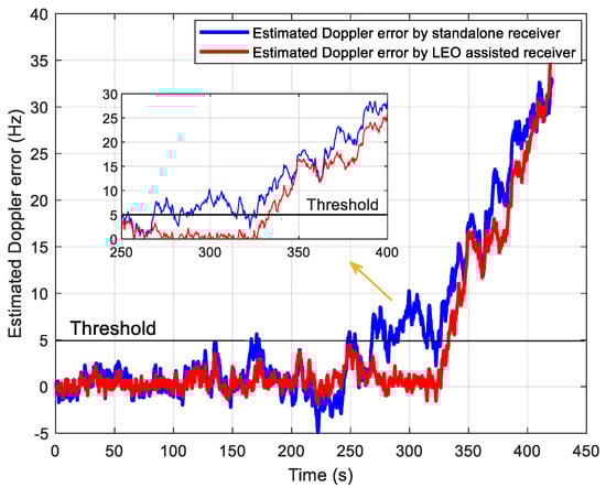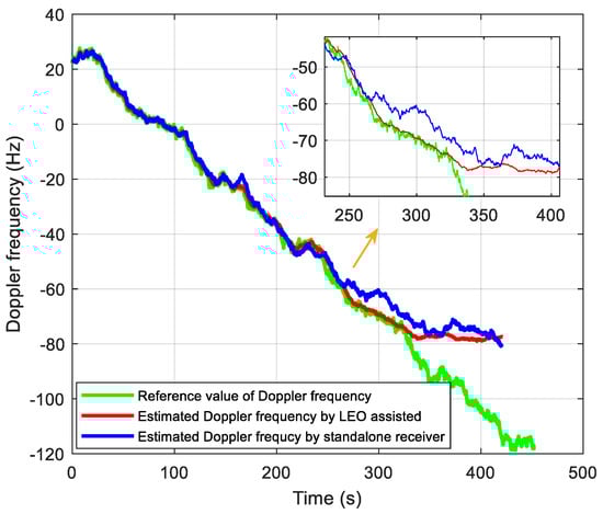 In the signal tracking performance test, we generate a set of intermediate frequency data whose C/N0 decreases from 21 to 1 dB-Hz with a speed of 2 dB per 40 s. The traditional tracking method without assisted information is realized for comparison, where the total integration time is set to 400 ms, including a 20 ms coherent integration time and 20 non-coherent integrations. The tracking results are shown in Figure 15 and Figure 16. Figure 15 shows the estimated Doppler with and without the LEO assistance. Moreover, Figure 16 shows the estimated Doppler errors relative to the reference value of the Doppler frequency. When the estimated Doppler error exceeds the threshold of 5 Hz, it is considered to lose lock. We can see that the proposed tracking method can track up to 320 s, corresponding to C/N0 at 5 dB-Hz. It is consistent with the performance analysis in Figure 13. For the traditional method, it can be seen the estimated Doppler error exceeds 5 Hz at 250 s (9 dB-Hz), resulting in a loss of lock. Such a high-sensitivity performance in the standalone receiver is mainly from the DA-based FLL structure mentioned above. Thus, the tracking sensitivity of LEO-assisted method is improved by about 4 dB compared with the unassisted method.
