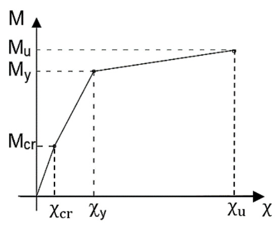 In reinforced concrete beam elements, there are several sources for nonlinear behavior; the most common is due to the cracking of concrete that appears when the tensile stress in the concrete overcomes the tensile strength. In this case, the cross-section is no longer entirely reactive, and consequently, the structural behavior is nonlinear. For beams, the nonlinear behavior can be taken into account with the bending moment-curvature diagram that describes the structural response of a reinforced concrete section in bending, assuming a planar deformation. In particular, the bending moment-curvature diagram can be obtained from the geometry and the stress–strain relationships of the materials of the sections by assuming a perfect reinforcing steel-concrete bond and no axial actions applied. The diagram is schematically characterized by three main branches (Figure 1):
