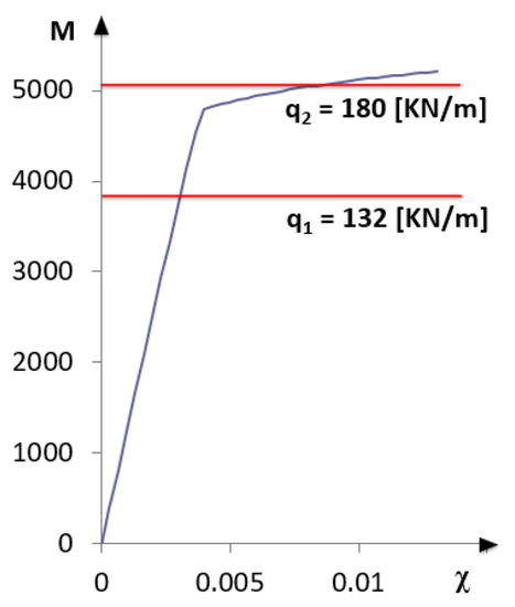 Increasing the load up to q2 = 180 KN/m, a maximum bending moment of approximately 97% of the ultimate bending moment (Mu = 5208 KN·m) is produced (Figure 3). In this case, in a zone of about 3 m across the midspan of the beam, the acting bending moment exceeds the yielding bending moment, as reported in Figure 6.