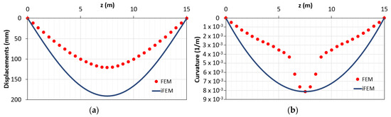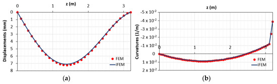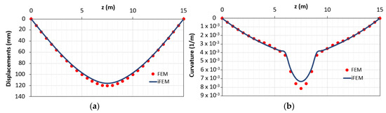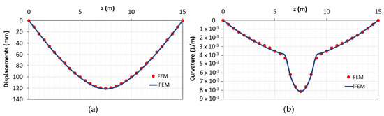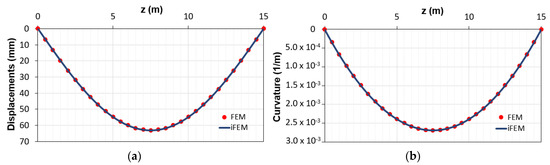 Comparison between direct finite element method (FEM) and inverse finite element method (iFEM) solutions in terms of (a) displacements diagram; (b) curvature diagrams.