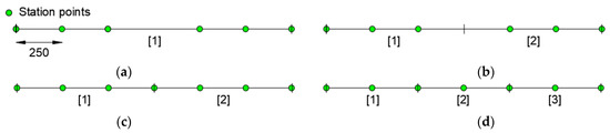 Modeling configuration: (a) one element with six station points; (b) two elements with three station points; (c) two elements with four station points; (d) three elements with three station points.