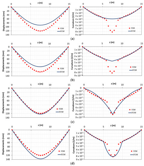 It can be seen that, unlike in configuration “c” (where each inverse element interpolates discontinuous curvatures within the three different phases), for configuration “d” there are inaccuracies mainly in the central element (between z = 5 m and z = 10 m) because it includes both zone in 2nd and 3rd phase (Figure 9b). Due to this reason, the displacements of the configuration “d” are overestimated (Figure 9a). Therefore, configuration “d” can be considered as the most accurate in terms of reconstructed curvature because it shows a lower percentage difference of the curvature for a longer length despite the overestimation along the plastic zone.
