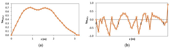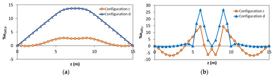 Comparing the results of the configuration “a” and “b”, it can be seen that better results are obtained considering two elements instead of one. Nevertheless, the best results are obtained when the station points are also placed in the yielded area (configuration “c” and “d”). To better clarify the results obtained according to the different configurations “c” and “d”, it is possible to analyze the percentage difference eDiff,x along the length of the structure (Figure 9a,b).