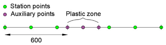 Taking into account the two observations above, an increase of station points and mesh discretization is investigated (Figure 7). In particular, configurations “a” and “b”, with one and two elements, respectively, have no station points in the yielded zone (Figure 7a,b), whereas configurations “c” and “d”, with two and three elements, respectively, have station points located in the yielded zone (Figure 7c,d). Configurations “a” and “b”, have been obtained with inverse elements having, respectively, three and one redundant station points with respect to the strictly required [15].