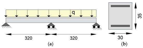 To test the applicability of the iFEM to statically indeterminate reinforced concrete structures, a continuous beam with two spans of 3.2 m and uniformly distributed load q is considered (Figure 16a). The rectangular cross-section of 0.30 × 0.35 m is symmetrically reinforced with As = As’ = 1256 mm2 (Figure 16b) and has a concrete cover of 35 mm. Both the concrete and the reinforcing steel characteristics are equal to the previous example. The beam is considered uniformly reinforced from the supports to the middle span.