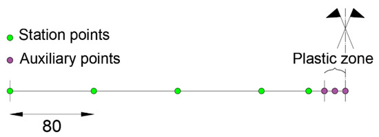 Finally, the procedure to identify the beginning and the end of the element where to model the plastic zone is applied, considering the station points of the configuration “c” and “d”. The same steps from (1) to (3) performed in the previous example are used, and then a similar configuration related to the auxiliary station points (beginning and end of the plastic zone) is considered. The difference with respect to the previous example is that the curvature in the central station point is a known input data (see green bullet between the two violet bullets in Figure 13).