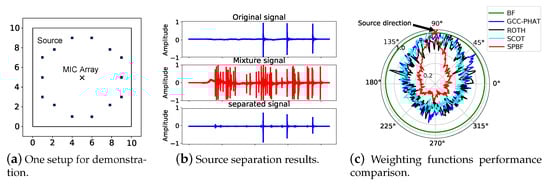 Figure 2b. The results reveal that the demixed signal is highly consistent with the original one. We then inspect the impacts of our proposed weighting function on the beamforming algorithm. In this experiment, we utilize only one sound source (footstep sounds). For comparison, we also implement GCC-PHAT [