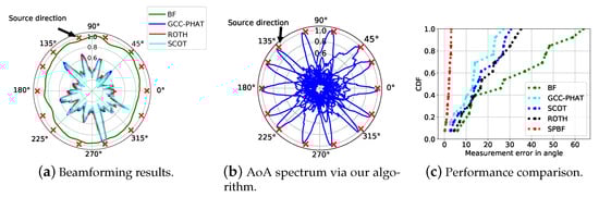 Figure 3b. It is obersevable that AoA spectrum of SPBF is sharper and has less side lobes than other algorithms, indicating the effectiveness of our proposed algorithm. We have also extensively evaluate the localization performance between vanilla beamforming, GCC-PHAT, SCOT, ROTH, and SPBF. The results presented in