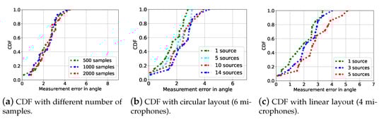 Figure 4a. It is observable that the number of samples or equivalently the duration of signals impose negligible impacts on the localization performance. Since our algorithm can effectively work at a minimal of 500 samples (equivalently 10 ms given a sampling rate of 48 kHz), it is robust to the Doppler effect. We then conduct experiments when the number of sources is larger than the number of microphones and the results are shown in