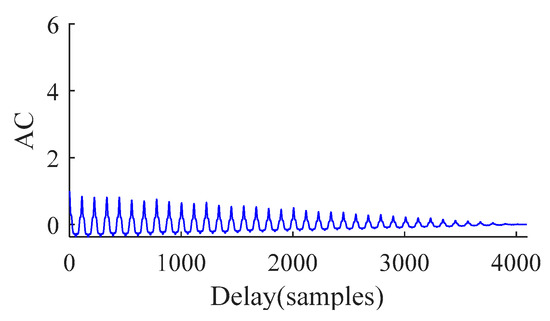 By carrying out the autocorrelation analysis of outer ring, the autocorrelation function (AC) spectrum of the original signal is obtained as shown in Figure 5. It can be seen from Figure 5 that the AC spectrum can reflect the periodic change of fault signal, which provides the basis for the estimation of fault period T. In order to estimate T, we further calculate the EHNR spectrum of signal as shown in Figure 6. It can be seen from Figure 6 that the fault signal shows obvious periodic change and gradually decays with time, which meets the trend of fault signal. Then, the fault period T = 112 is obtained.