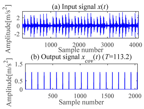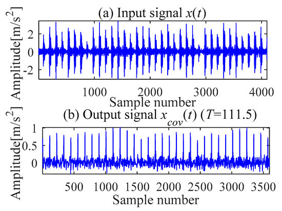 According to [38] and [30], we analyze the outer race fault signal with the fault period T = (90,134) and filter length L = 500. The multi-point kurtosis diagram is shown in Figure 10. When the multi-point kurtosis reaches the maximum value, the fault period T is 111.5. The optimal deconvolution signal xcov(t) is presented in Figure 11.