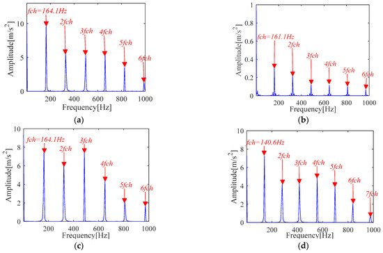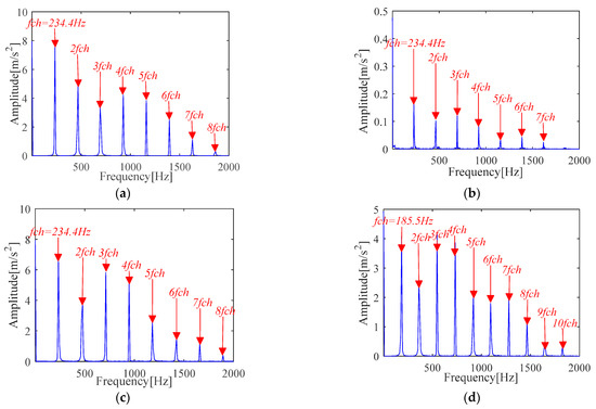 The fault characteristic frequency for the inner race and outer race extracted by FK is shown in Figure 32. Comparing with the fault characteristic spectrum extracted by MOMEDA based method as shown in Figure 30 and Figure 31, it can be seen that the fault characteristic frequencies can be accurately obtained by FK. However, there are many interference components in the spectrum, which result in the faint characteristic amplitude. In particular, the outer race seems to be more seriously disturbed by noise, and only three times of double frequency is extracted, while the other two methods can extract nine times of double frequency. In addition, through the comparison of performance indicator SNRfd presented in Table 8, it is also found that the IMOMEDA-TKEO method can achieve better performance than the MOMEDA-TKEO method and FK method in noise reduction.