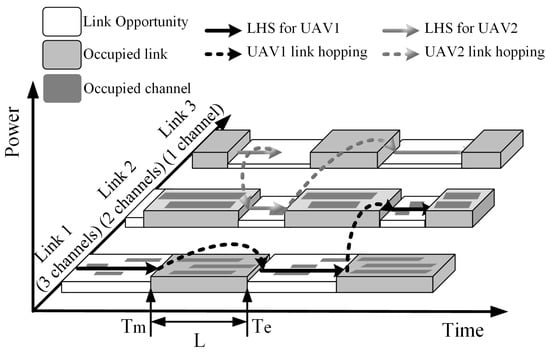 A conceptual diagram for the RA-OLS scheme is shown in Figure 1. The PU traffic model which reveals the occupancy information in wide bandwidth is represented as a binary ON/OFF model [22]. Given the time-varying feature in the spectrum, white blocks form a link opportunity set I aiming to be used by UAVs. The dark blocks are the congested links that need to be avoided in the utilization. The solid lines with arrows are the desired LHS schemes , and the virtual lines represent the link-hopping maneuver between I.