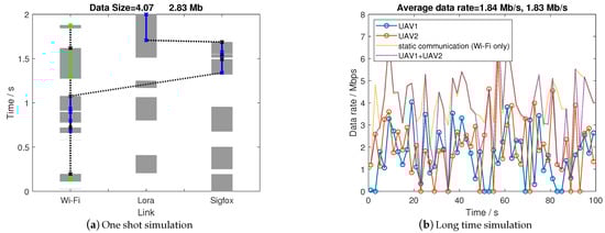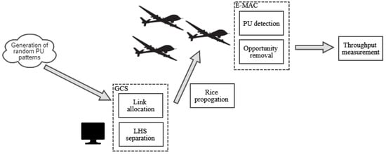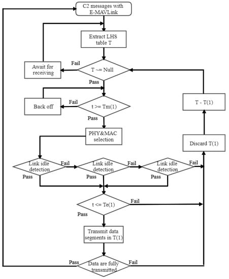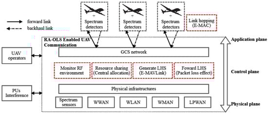 With an assumption that PUs are unknown in prior, the spectrum processing is critical to obtain the real-time PU traffic information in the function of monitoring RF environment, where several detection, identification, and prediction methods [23,24] were proposed. Based on the extracted PU features, the resource sharing function enables the collaborative occupation of spectrum resources among UAVs, where the contention issue is mitigated in such a centralized mechanism. Along with the C2 messages received from UAV operators, the LHSs are segmented into multiple frames, packed with the unified data structure, and forwarded to UAVs, where the packet dropout effect is critical because of unreliable upload links and lacking static backhaul link solutions. The link hopping function conducted among UAVs is to implement the data transmission through multiple links, whilst the link establishment and maintenance in the current link solutions are not considered.