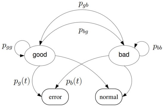 - Hasslinger, G.; Hohlfeld, O. Analysis of packet errors in Gilbert-Elliott channels. In Proceedings of the 2011 IEEE 12th International Workshop on Signal Processing Advances in Wireless Communications, San Francisco, CA, USA, 26–29 June 2011; pp. 216–220. [Google Scholar]