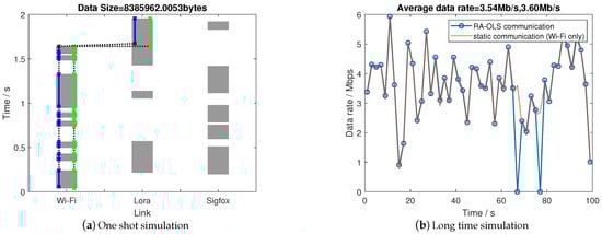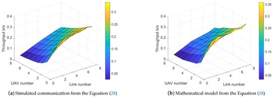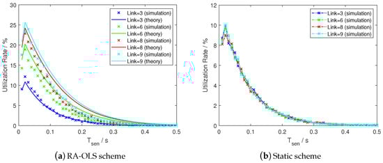 Furthermore, we compare the performance between the RA-OLS and the static scheme by differing the link number M and the result is presented in Figure 14. A similar result that the proposed mathematical throughput model is valid for measuring the simulated communication scheme can be obtained by having small absolute errors, i.e., less than 3% in Figure 13a and 2% in the Figure 13b.
