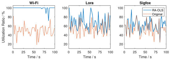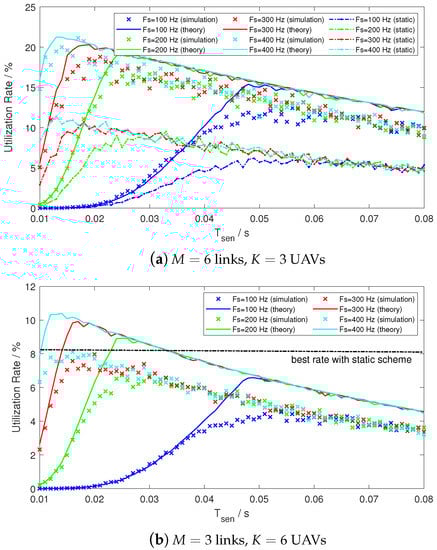 In this section, we use the static communication scheme (see the Section 3.3) without having the dynamic access mechanism as the benchmark for the performance comparison purpose, as well as using the definition of utilization rate U in the Equation (27) for measuring the performance. We use Wi-Fi configurations presented in Table 2. The implementation of the static link is similar to the RA-OLS discussed in Section 4.1, whilst only the determined links are allocated to its corresponding UAVs to prevent having the link-hopping mechanism.