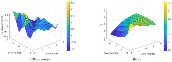 Given the parameters relevant to the packet drop rate , i.e., distance between UAVs and GCS d, reference distance , reference transmission power , receiver sensitivity , and good state and bad state probabilities and , this section performs the sensitivity analysis in terms of packet drop rate , relative error e and throughput by varying some of configurations. For instance, d ranges from 6000 m to 18,000 m with a constant interval of 4000 m; receiver sensitivity ranges from 6 × 10 to 1.8 × 10 with a constant interval of 4 × 10; and ranges from to with an interval of . The UAV number K and link number M are set to 5, respectively (the packet drop rate shows fixed impacts with various K and M). We calculate the relative error for which is the opportunity number received successfully by UAVs during , and UAV throughput by repeating simulation for 1000 times (the relative errors are denoted as and ). Other parameters remain the same discussed in Section 4.3. The thorough sensitivity table caused by the uplink packet drop factor is presented in Table 5.