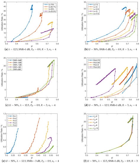 Regarding several parameters exist in the model bringing difficulty in choosing the favorable values, as well as the selection of values essentially is a trade-off problem, this section simulate the RA-OLS communication versus IF factor (23) (the LHS length is reflected in IF). We use the definition of in Section 4.1 to measure the density of link opportunities and to denote the length of link opportunities in the PU pattern factor. We use SNR and as the parameters to characterize the spectrum sensing failure. Time effect in the E-MAC is measured by differing R number, along with varying in the range of . We use to differ the E-MAVLink length. The configurations, e.g., , , SNR=1 dB, , and are selected as the benchmark value along with other configurations presented in Section 4.1. The results of the utilization rate U obtained from Equation (27) versus are presented in Figure 12.