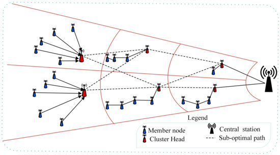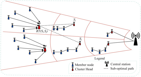 Selecting the optimum route among the cluster heads may lead to the consumption of energy levels across the route. This causes a considerable differences in the energy levels between nodes, which eventually induce partitioning of the network. Therefore, we have developed an energy-aware and a probabilistic multi-hop routing protocol to connect the cluster heads. Through the suggested MIMO-HC, we are attempting to detect several paths from the cluster heads to the central station, and the probability of selection is allocated to every route. Using the probability, one of the routes for each interval of data transfer from the Cluster Head to the central station is chosen randomly (), see Equation (10). Figure 5 describes the proposed inter-cluster sub-optimal multi-hop routing.