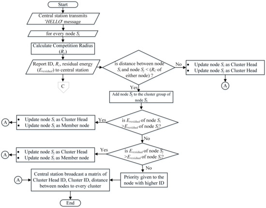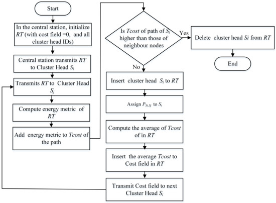 Figure 6 is the flow chart for the inter-cluster multi-hop routing topology. Upon identifying the Cluster Head and its belonging member nodes for the current running round, the central station creates a routing table (RT) and next broadcasts it to the intended Cluster Head. Before transmitting the generated routing table to the network, the central station attaches a set of Cluster Head IDs to the RT and at the same time determines the cost field in the RT with value zero (i.e., ).