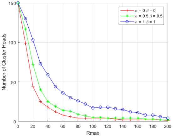 Here, we study the correlation among and the number of cluster heads when and take distinct values. Figure 7 shows the generated number of cluster heads in the network for the MIMO-HC. Figure 7 shows that if and are given a value of 0.5 each, the number of generated cluster heads would be smaller than and if their values are 1 each. Besides that, having value of 0, and value of 0 generates the least number of cluster heads. This is mainly attributable to the increase in the Competition Radius. In addition, with the decrease in radius, and and each with value of 1, the number of generated cluster heads increases. This implies the number of cluster heads produced is specified by , , and .