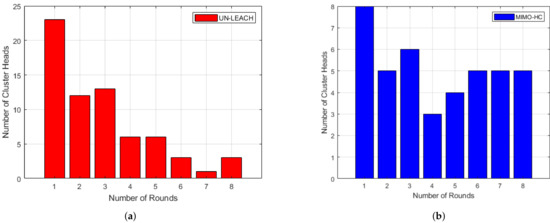 In our suggested MIMO-HC, we give and value of 0.5 each, and have value equal to 50. Figure 8 demonstrates the distribution of cluster numbers in both MIMO-HC and UN-LEACH. The numbers of clusters in MIMO-HC are steadier in contrast to UN-LEACH. This is attributed to the random technique that has been employed in UN-LEACH to create cluster heads, resulting in a totally changeable number of clusters.
