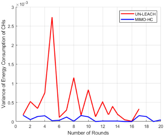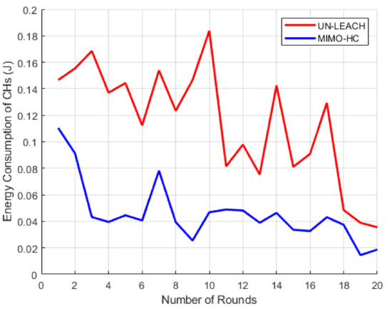 Here, the energy efficiency of the proposed MIMO-HC is analyzed. Figure 10 shows the energy cost that the cluster heads expense at MIMO-HC and UN-LEACH algorithms. The horizontal axis displays 20 sampled rounds of simulation, while the vertical axis displays the cost of energy expended by the cluster heads. The findings reveal that the energy that cluster heads consume on MIMO-HC in every round is much lower than when using UN-LEACH. Furthermore, by looking at Figure 11 the MIMO-HC equalized the depletion of energy among the cluster heads better than UN-LEACH. This happens due to cluster heads convey data in the UN-LEACH direct to the central station, and that incurs extra energy. Another factor is in the UN-LEACH method the cluster heads are not spread equally all over the network because of the random selection of the cluster heads.