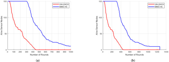 Figure 8 shows that the number of clusters in the MIMO-HC is steadier than in the UN-LEACH. Additionally, Figure 12 shows that the number of clusters in MIMO-HC has longer stability period than the UN-LEACH, where all the nodes in the MIMO-HC remain alive for 300 rounds and 50 rounds for the UN-LEAH. Consequently, the MIMO-HC has stable type of cluster in each round. This is due to the MIMO-HC can generate unequal clusters (using Equation (3)). In addition, using a Th value can ensure that clusters closer to the central station with small radius will use multi-hop topology and clusters far away from the central station with large radius will use single-hop topology.