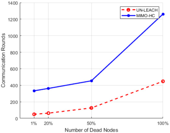 Finally, Figure 13 depicts the number of communication rounds in an area of 200 m × 200 m when a 1, 20, 50, and 100% of sensors perishes. Sensors at this area start to fall at a faster pace after around 20% of the sensors have perishes. This is attributed to the large range among the sensors, and each sensor node wants to be a leader head. This induces a quick energy consumption. The number of rounds in MIMO-HC is approximately 3 times more than in UN-LEACH [11], when 1, 20, 50, and 100% of sensors perishes for a zone size of 200 m by 200 m. In addition, Figure 14 displays the result of an area of 200 m × 200 m with 300 node density (i.e., with an additional 150 nodes) when a 1, 20, 50, and 100% of sensors perish. It shows that the network in the proposed MIMO-HC is scalable and has a longer network lifetime than the network with only 150 nodes. This is, therefore, the additional nodes deployed can be regarded as increasing the total energy of the network.