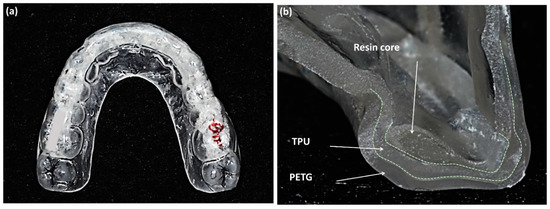 (a) Oral-treaper (OTP) retainer for maxillary dentition; (b) the three layers of the OTP on the incisor at the sliced surface, reinforced resin core, thermoplastic polyurethane (TPU), and polyethylene terephthalate glycol (PETG) (Forestacryl and Track B thermoforming foils, Forestadent, Bernard Förster GmbH, Pforzheim, Germany).