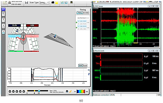(a) T-scan system (Tekscan Inc., South Boston, MA, USA) and electromyography (EMG) recording device (BioEMG IIITM, BioResearch Inc., Milwaukee, WI, USA) application to a patient. The patient sits in an upright position and bilateral electrodes are placed on the temporalis anterior (TA) and masseter (MM) muscles, simultaneously with the biting T-scan sensor. (b) The position of electrodes attached to the TA and MM muscles is shown on the side view. (c) Computer display of the occlusal force and muscle activity at maximal intercuspal position (MICP).