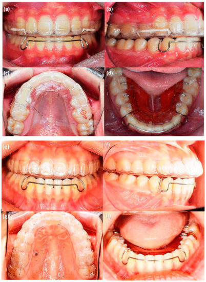 - Aslan, B.I.; Dinçer, M.; Salmanli, O.; Qasem, M.A. Comparison of the effects of modified and full-coverage thermoplastic retainers on occlusal contacts. Orthodontics 2013, 14, e198–e208. [Google Scholar]