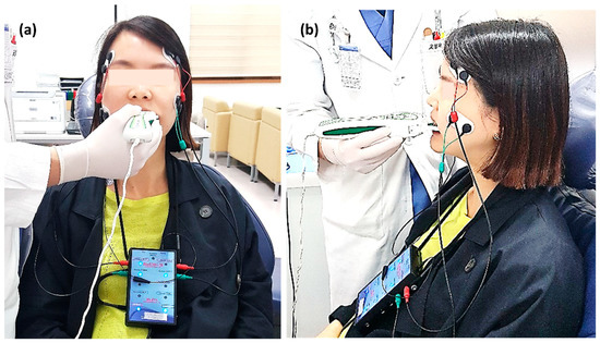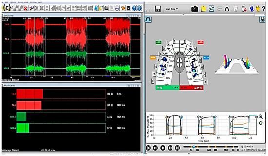 At each time point, subjects underwent occlusal and muscle activity analysis with the T-scan Novus ver.9 system and BioEMG III system (BioResearch Inc., Milwaukee, WI, USA) in the multifactor malocclusion service (MMS) clinic of Kyung Hee University Dental Healthcare Center (Figure 2 and Figure 3). All recordings were made with the patient in an upright position in the unit chair. After the skin was cleaned with 70% isopropyl rubbing alcohol, EMG electrodes were placed onto the TA and MM bilaterally. The T-scan sensor was also placed in the subject’s mouth. The T-scan and EMG recordings were simultaneously recorded (Figure 5).