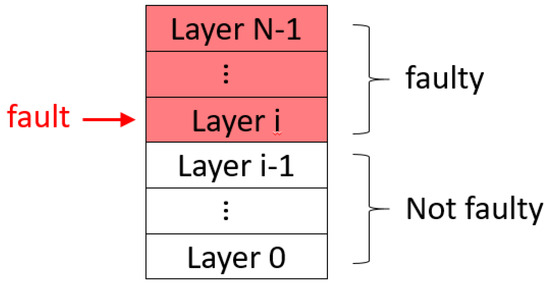 This means that a system fault in a lower layer can result in the failure of the liveness of all upper layers, but a system fault in an upper layer cannot impede the liveness of any lower layer. For example, Figure 2 is an N-layer system. When a system fault occurs at the layer (0 ≤ i ≤), all the layers above must fail. On the contrary, all the layers below the do not fail. An example in a real system: When the host network fails, the user cannot access the VM, but the host power and OS are still live. Similarly, the network being busy (transient fault) causes the VM to be temporarily inaccessible until the network becomes live again, and the VM will not be damaged after the network stops being busy.