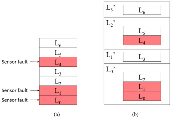 In Figure 4, Figure 4a is a seven-layer system in which the sensors , , and have failed. Then, we merge , , and into one combination layer and merge and into another combination layer based on the proposed fault model reconstruction method, one at a time. The final result is shown in Figure 4b. Thus, we can detect the system faults of , , and through and detect the system faults of and through . After that, we obtain a new layer list, which contains , , , and . This means that the seven-layer system becomes a four-layer system. Moreover, the layers in the new layer list still have liveness layer dependency.