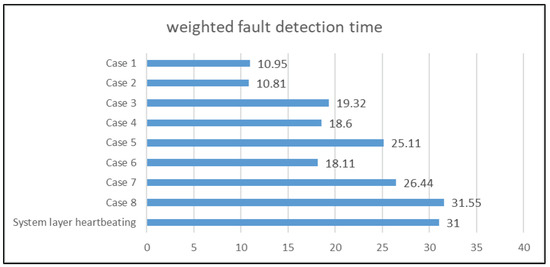 For comparison, the weighted system fault detection time of each fault model and system layer heartbeating was needed. To calculate the weighted fault detection time of different fault models, we needed to multiply the system fault probability by the average system fault detection time for each system fault type and then add them together. The system fault probability values used in this study were based on the National Center for Supercomputing Applications (NCSA) Platinum and Titan fault data summary [36]. As the software fault included the system fault of the VM process, the host network, and the host OS layers, the system fault probability of these three layers was 26.2%. In addition, as the host OS layer could detect hardware system faults, the system fault probability of the host OS layer was 26.2 + 2.84 = 29.04 (%). In summary, the system fault probabilities from the VM process layer to the host power layer were 26.2%, 26.2%, 29.04%, and 18.56%, respectively. The results are shown in Figure 6.